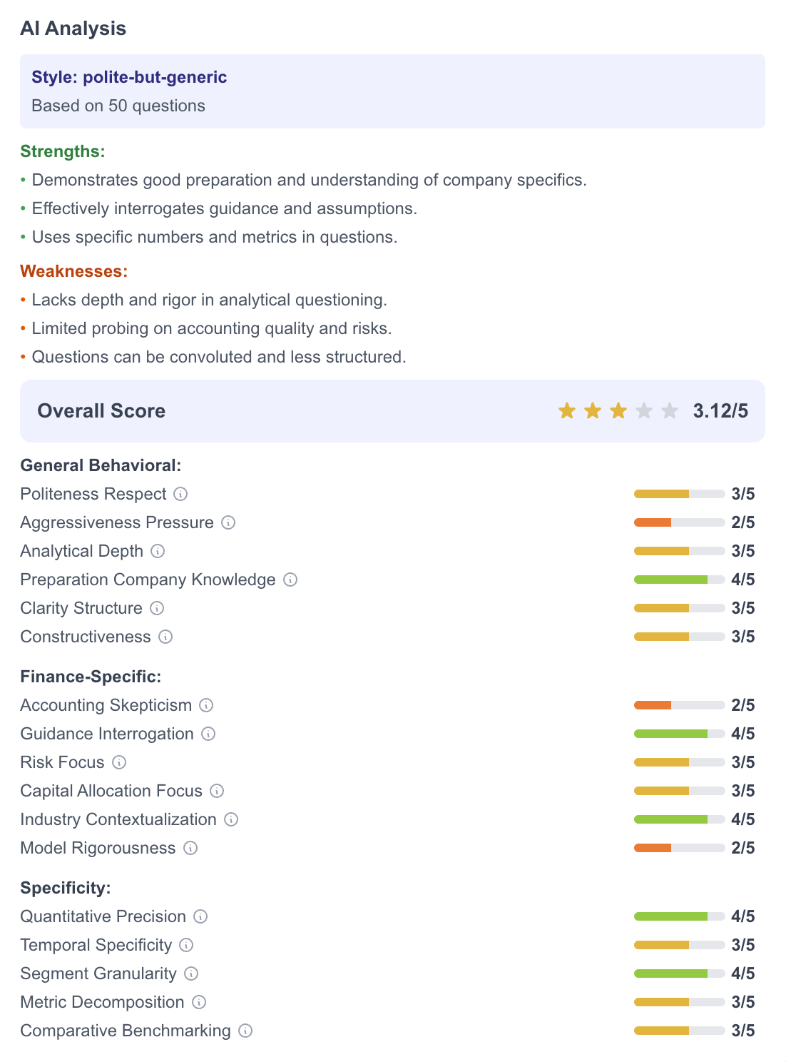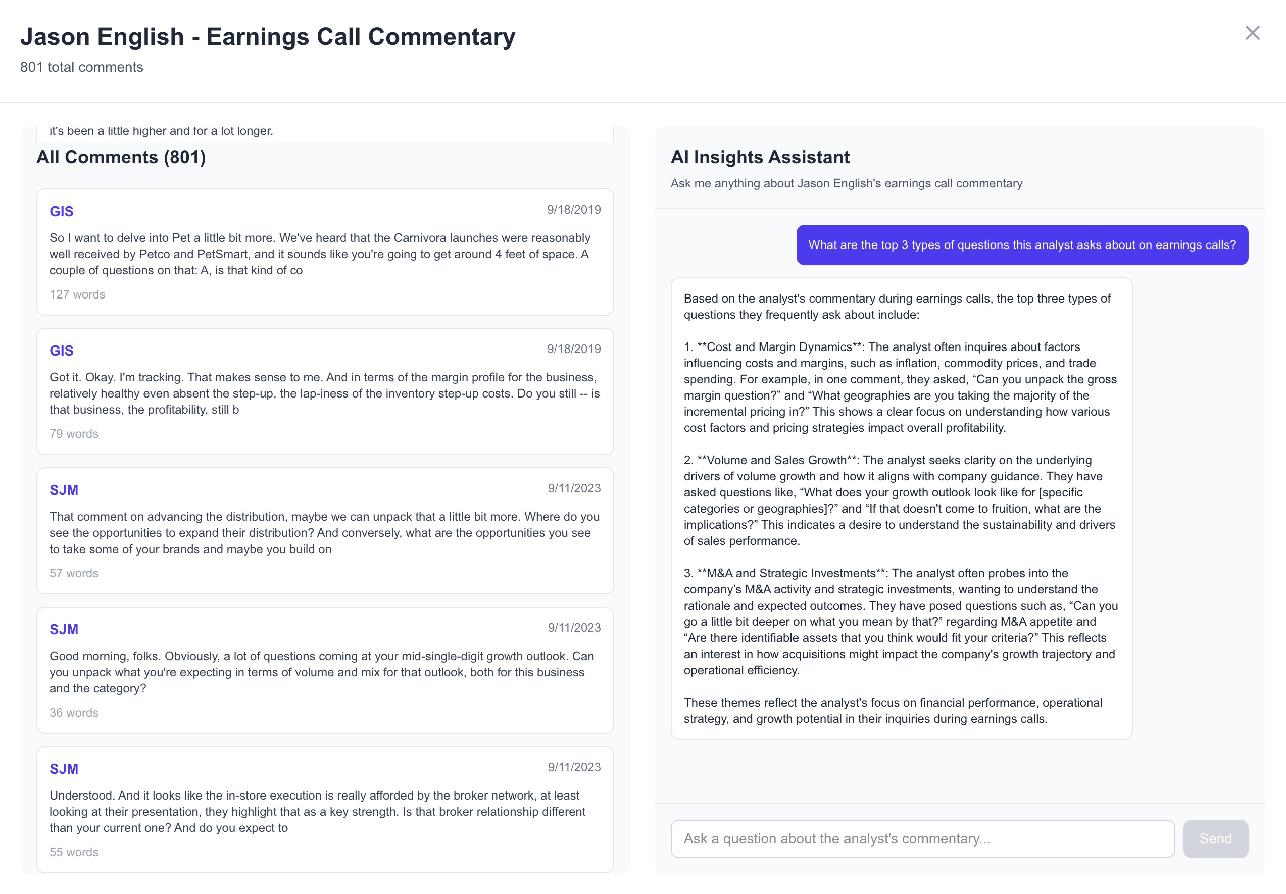 Chat with an AI trained on all of an analyst's earnings call questions to understand their analytical style and focus areas.